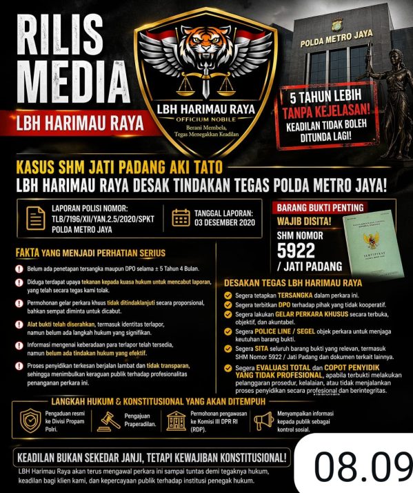 LBH Harimau Raya menegaskan, kasus ini tidak boleh dibiarkan berlarut-larut. Mereka mendorong agar aparat segera mengambil langkah konkret, mulai dari penetapan tersangka, penerbitan DPO, hingga pengamanan objek perkara.