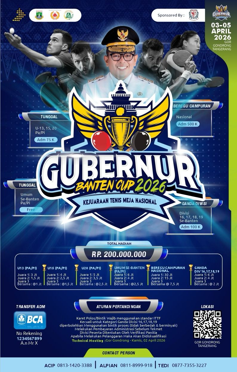 OBORBANGSA.COM, KOTA TANGERANG – Kejuaraan tenis meja nasional Gubernur Banten Cup I berhadiah total Rp200 juta digelar di Gor Gondrong Kecamatan Cipondoh Kota Tangerang, 3 – 5 April 2026. Gubernur Banten Andra Soni dijadwalkan membuka langsung kejuaraan tersebut Jum’at siang 3 April 2026 di Gor Gondrong.