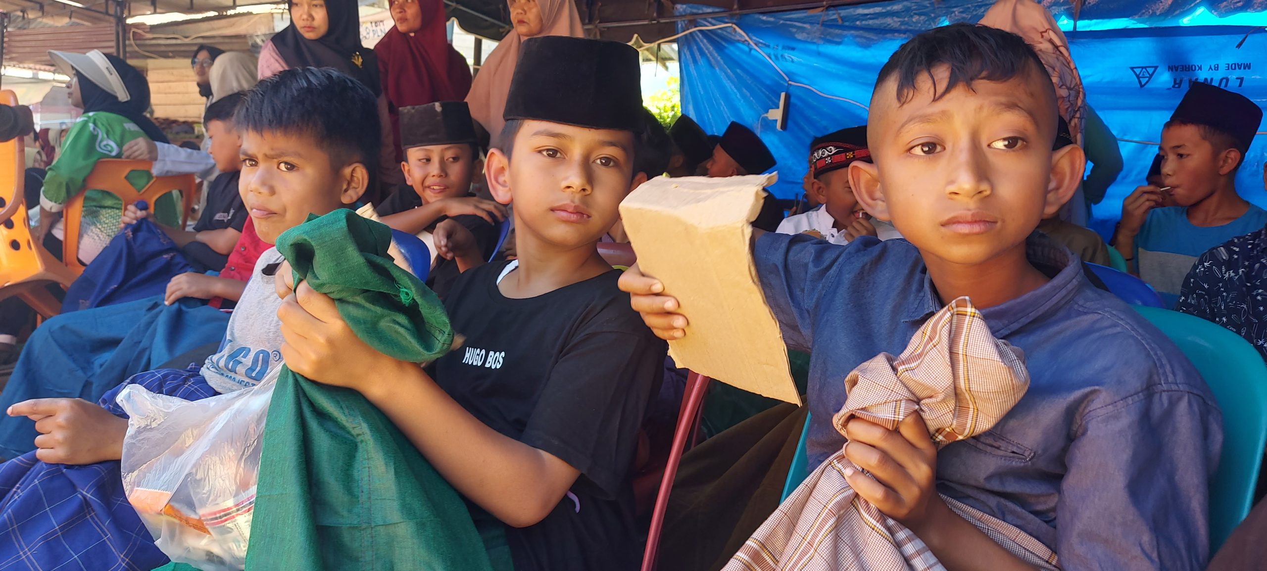 Pelaksanaan khitanan massal dilakukan secara sederhana namun penuh makna, yakni di bawah tenda-tenda BNPB berwarna oranye, yang selama ini menjadi tempat berlindung para pengungsi bencana.