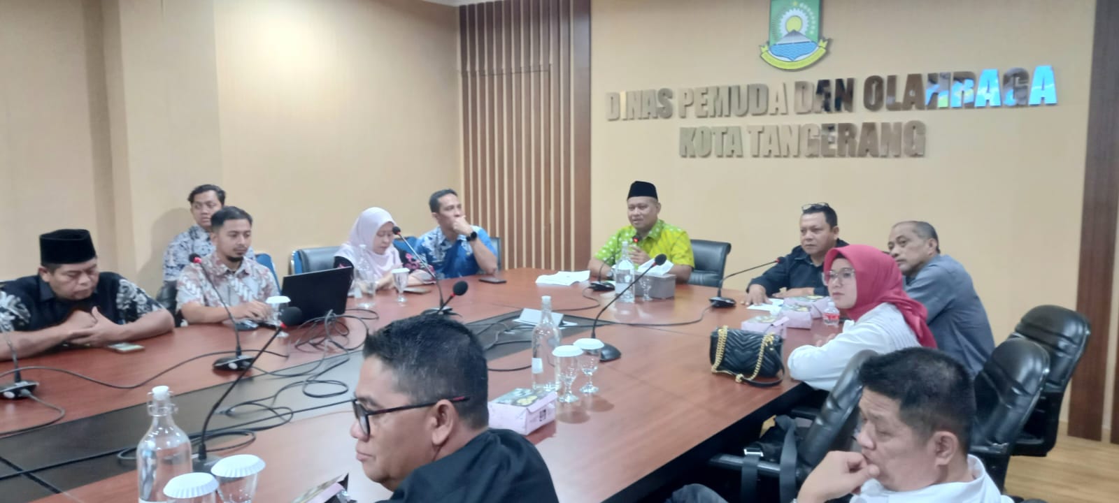 Kepala Dispora Kota Tangerang Kaonang diampingi Sekretaris Dispora Kota Tangerang Helmiati, Kepala Bidang Olahraga Dispora Surya Fani Ritonga dan Ketua Tim Kerja Pemberdayaan Olahraga Masyarakat Dispora Mulyadi menerima kunjungan studi komparatif dari Kabupaten Belitung di Gedung Cisadane Jalan KS Tubun Kecamatan Karawaci. (foto: oborbangsa.com/ateng sanusih)