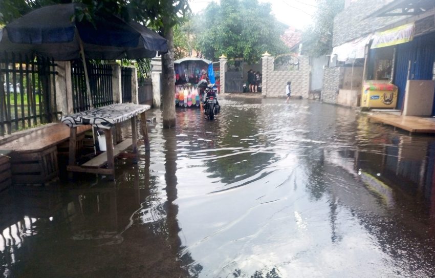 Kondisi air hujan yang tidak mengalir dan mengumpul di permukaan, diduga disebabkan sistem drainase yang buruk, intensitas hujan tinggi.