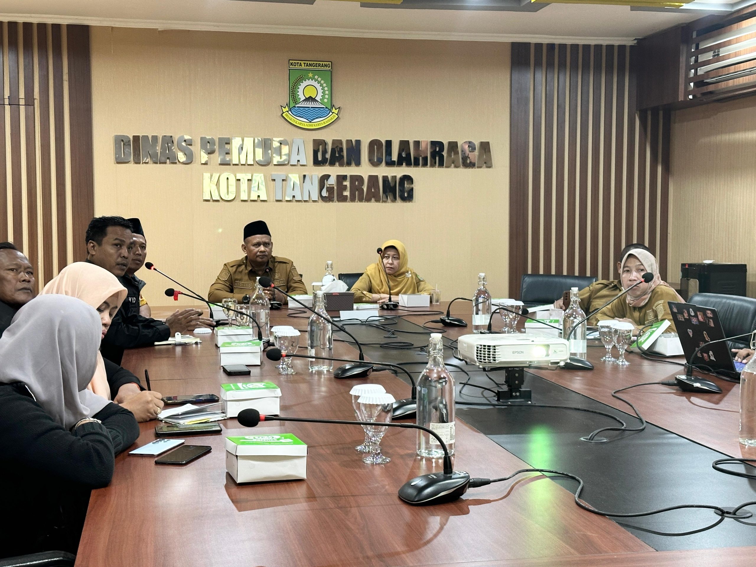 Kepala Dispora Kota Tangerang Kaonang bersama Sekretaris Dispora Helmiati, Kabid Olahraga Dispora Surya Fani Ritonga, Ketua Tim Kerja Olahraga Prestasi Dispora Elvida Nuke Nilvana dan Ketua Tim Kerja Pemberdayaan Olahraga Masyarakat Mulyadi menerima panitia Open Tournament Pencak Silat Tingkat Nasional Bumi Sukowati Championship II di Gedung Cisadane, Selasa pagi 14 April 2026.