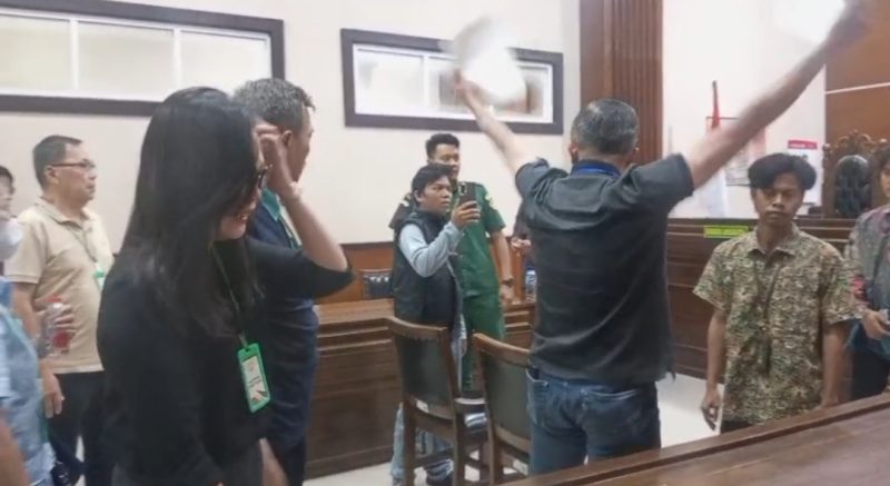 Situasi sempat memanas hingga petugas pengadilan turun tangan untuk meredakan kericuhan.