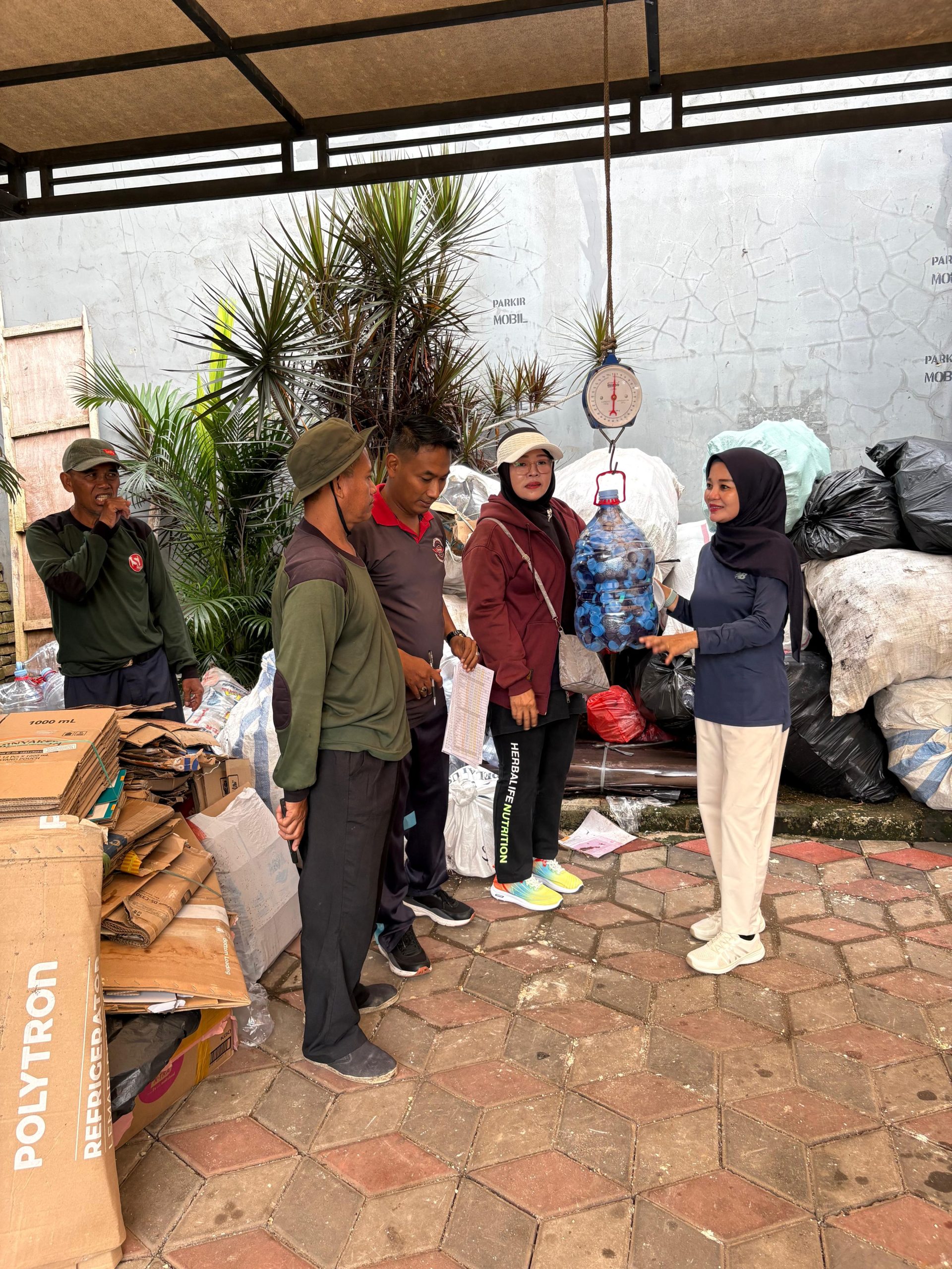 Kasi Tapem Kecamatan Karang Tengah Kota Tangerang, Elly Yusmiati (kanan) menimbang sampah hasil sedekah dari pegawai dan masyarakat. (foto: ist)