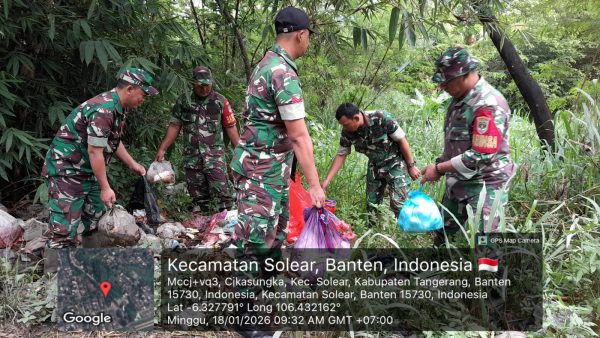 OBORBANGSA.COM – Kodam Jaya – TIGARAKSA – Sebagai wujud nyata kepedulian TNI terhadap kebersihan lingkungan sekaligus bagian dari pelaksanaan tugas pembinaan teritorial (binter), Serma Suhenda Babinsa Koramil 13/Cisoka, Kodim 0510/Trs kerja bakti membersihkan sampah di PerumbBukut Cikasungka, Kecamatan Solear Kabupaten Tangerang, Minggu (18/01/2026).